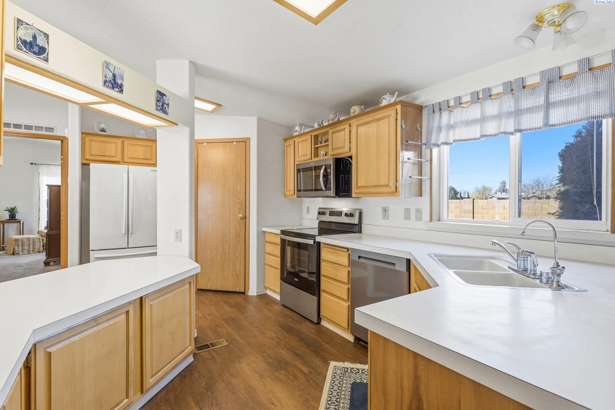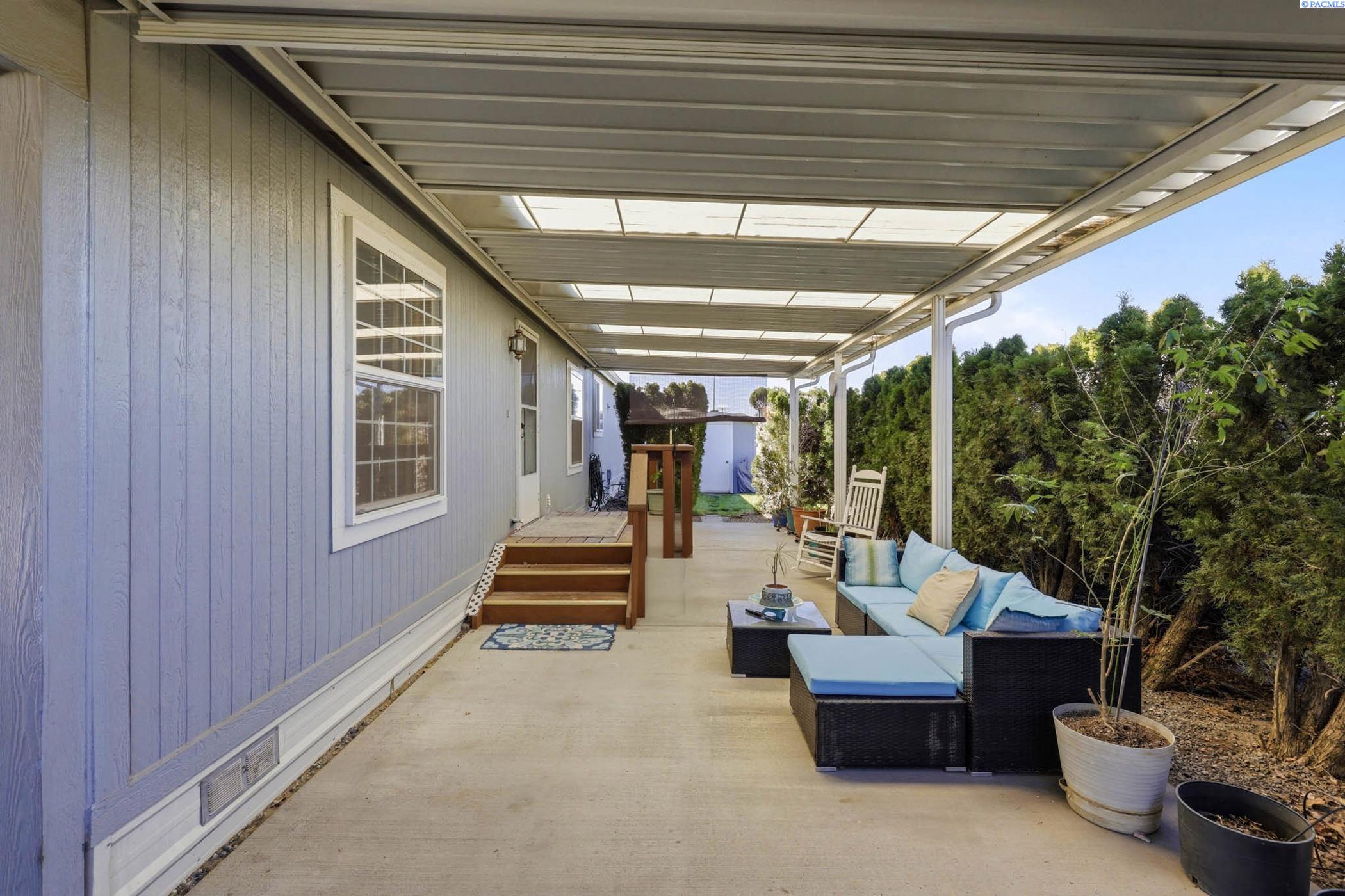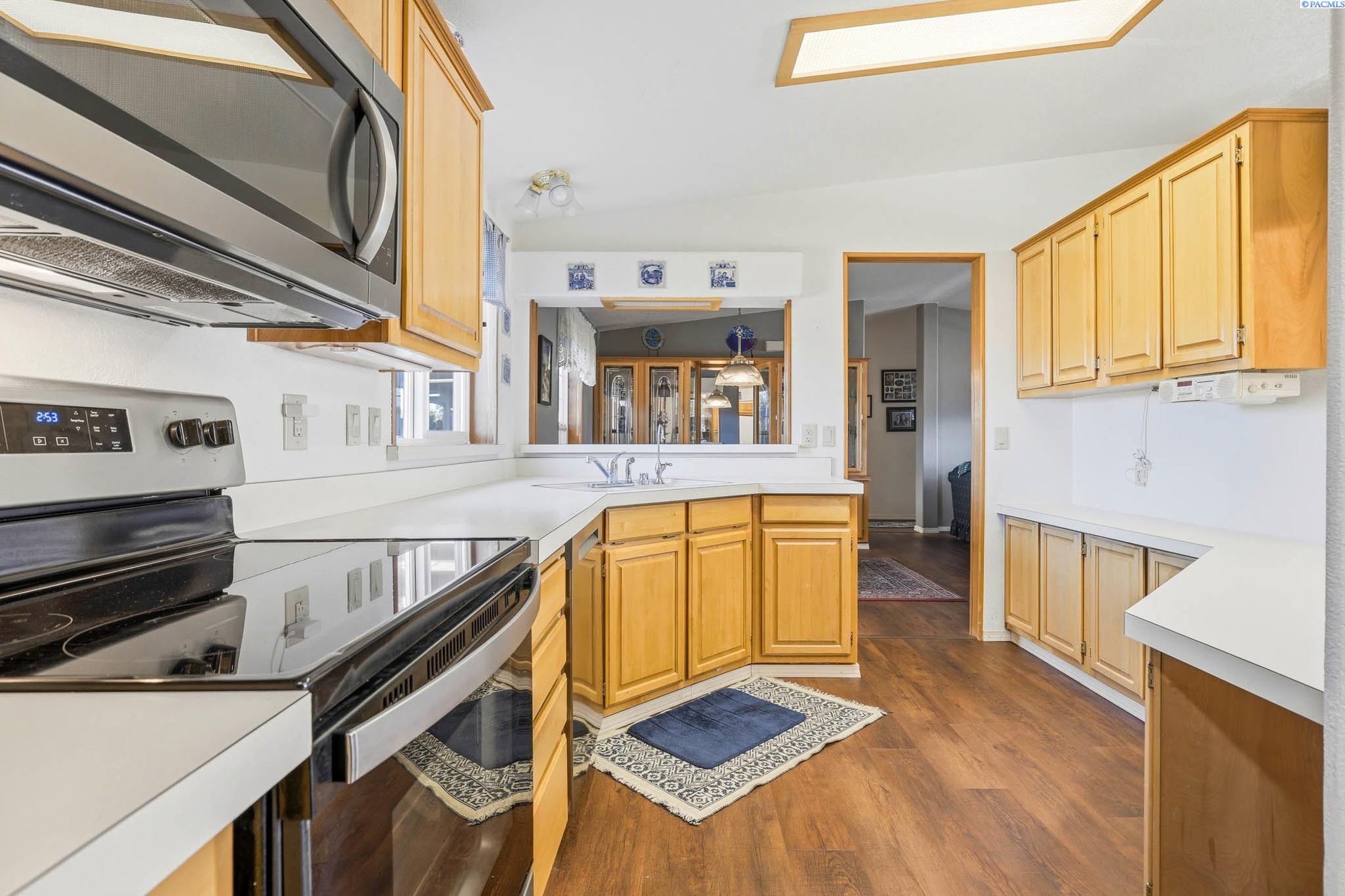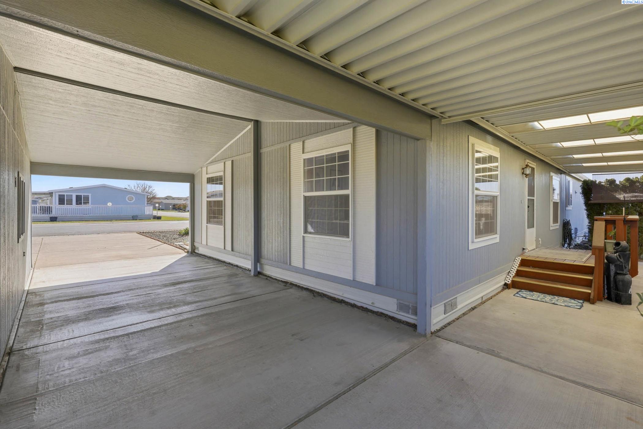 MLS# 291649 Well-maintained 3-bedroom, 2-bath manufactured home located in a highly desirable 55+ community. This home stands out as one of the few in the neighborhood offering a private one-car garage with built-in shelving, along with ample additional parking. Inside, you'll find a spacious, open layout with several updated, including vinyl wood Pergo flooring, a newer hot water and updated kitchen appliances. The bright kitchen features a pantry, breakfast bar, and plenty of cabinet space, making it both functional and inviting. All three bedroom include walk-in closets, while the primary suite offers new carpet, and in the primary bathroom there are double sinks, a separate vanity, and a walk-in shower. Skylights throughout the home provide abundant natural light. The laundry room includes extra storage and a utility sink for added connivence. Step outside to enjoy a large private covered patio and raised garden beds-perfect for relaxing or entertaining.