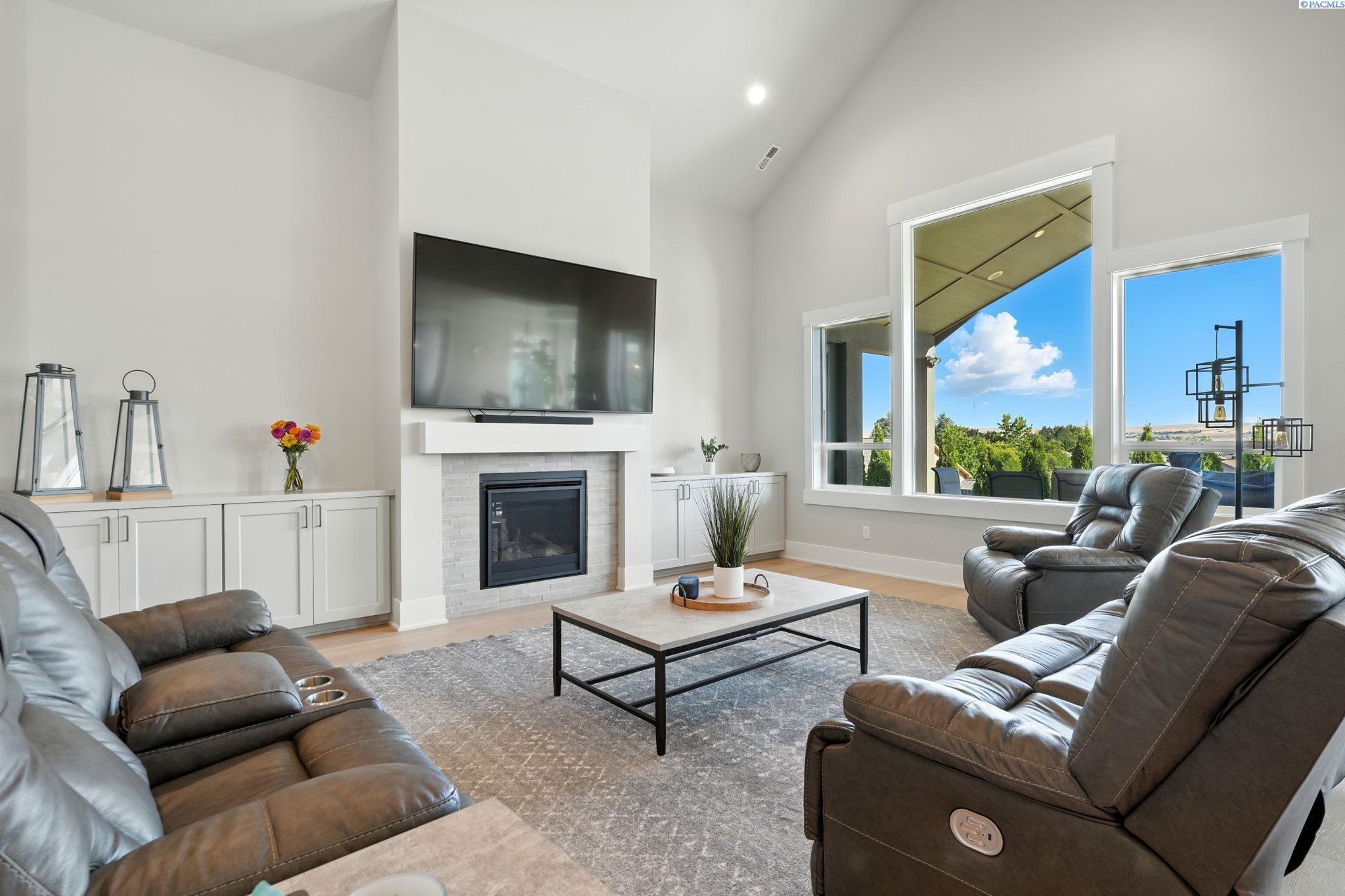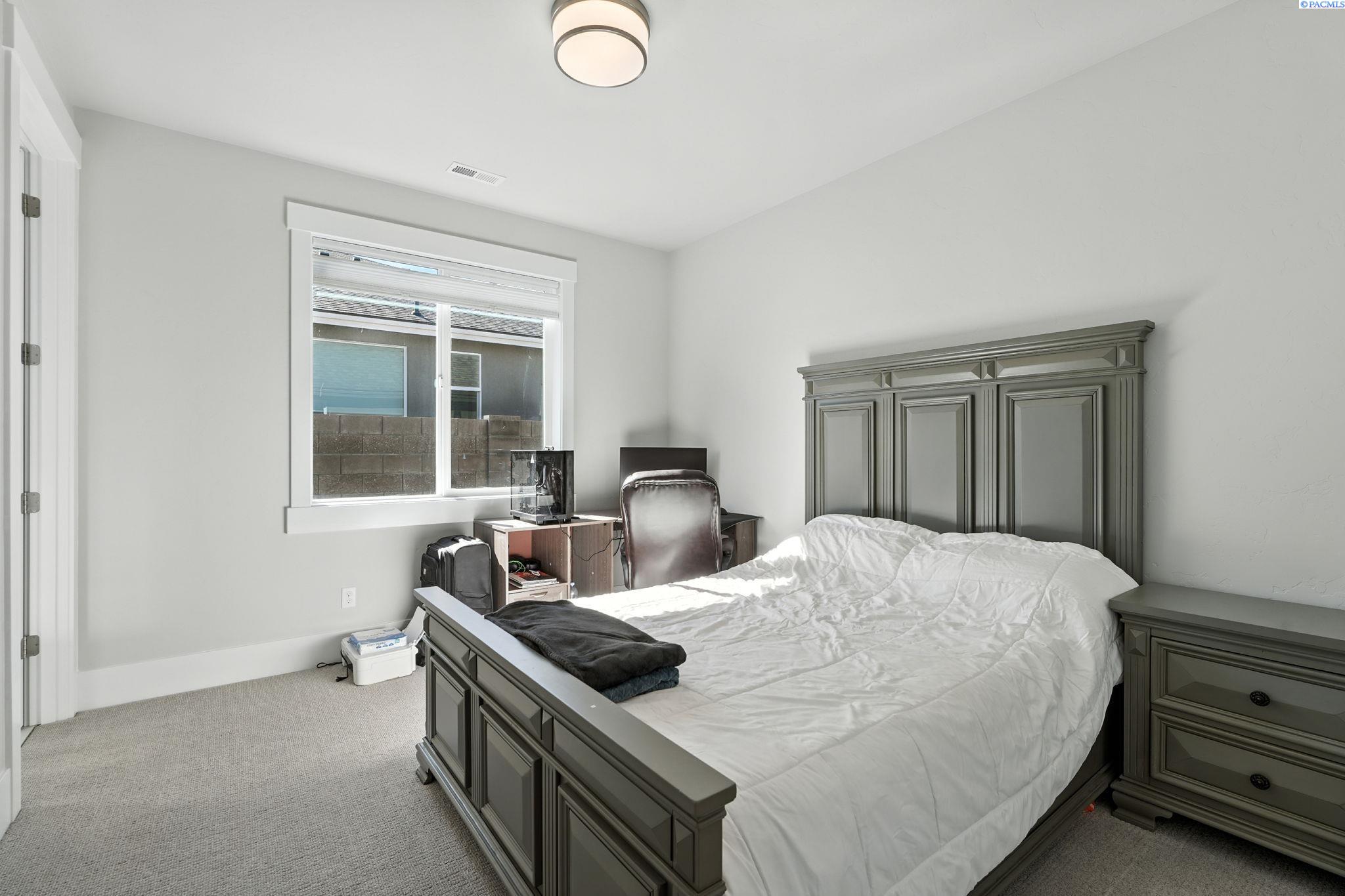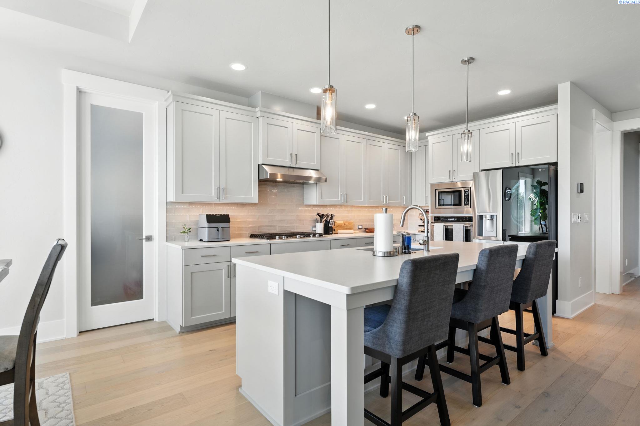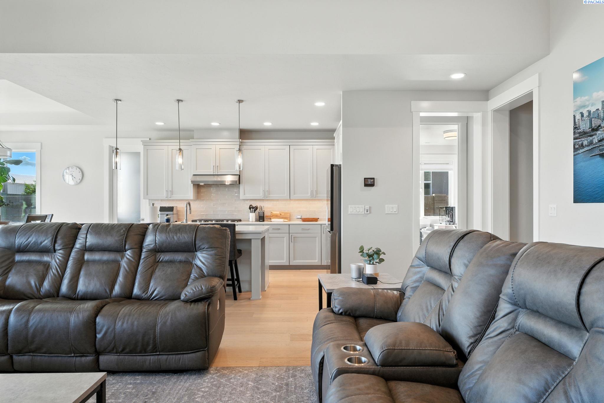 MLS# 286567 $3,500 buyer closing cost credit with preferred lender! Beautiful 2022 fully upgraded rambler. Covered front porch opens to soaring entry way, engineered hardwood throughout living areas, guest bathroom and bedroom to the left, entry way opens to great room with 18' ceilings fully wood wrapped windows with craftsman trim, white quartz kitchen with island, grey cabinets soft close cabinets with full backsplash, gas stainless steel appliances, glass door to pantry, master bedroom behind great room, full tile shower, pedestal soaker tub, private access to oversized back patio with vaulted ceiling, junior master suite located behind the kitchen, laundry room located off of the hallway to the garage, garage is fully finished with epoxy floors. Large community pool and rec center access. Great for hosting events and enjoying hot days!