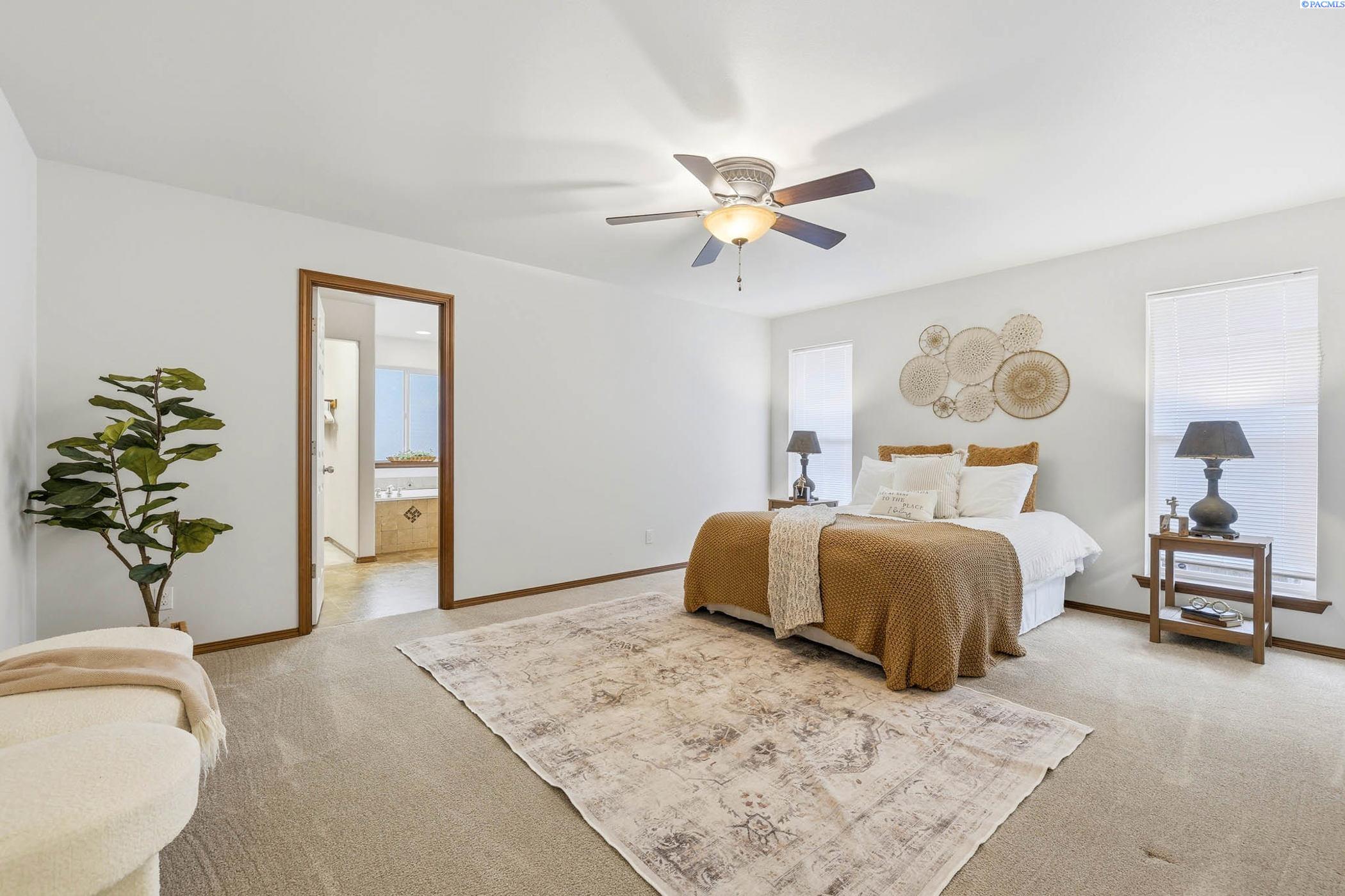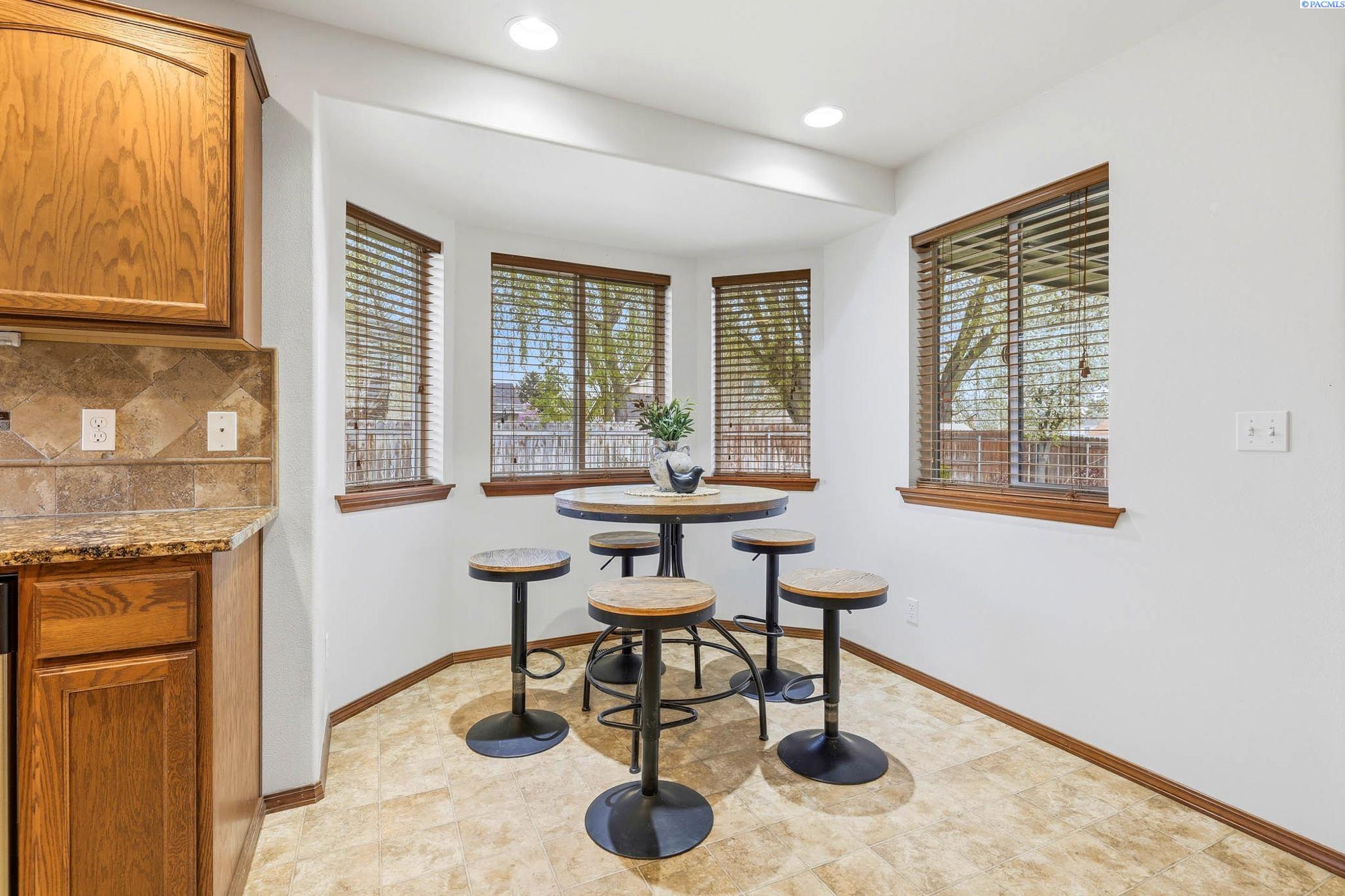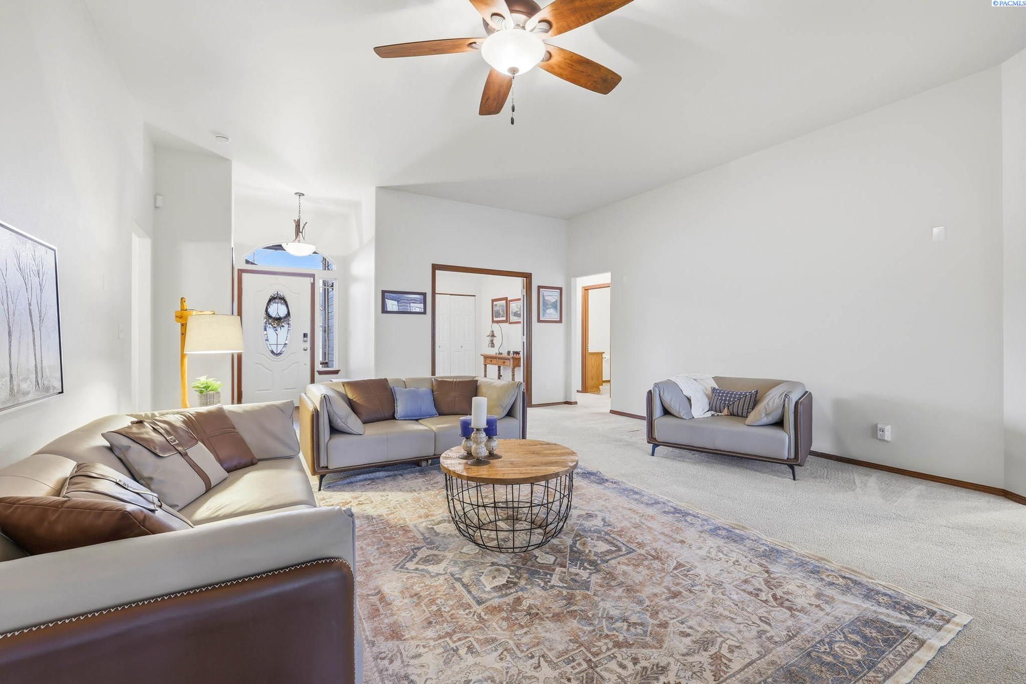 MLS# 291712 Tucked into a quiet cul-de-sac in central Kennewick, this well-designed home offers space, comfort and functionality with a layout that truly works for everyday living. Raised and vaulted ceilings, along with windows in every room, create a bright and open feel filled with natural light throughout. The floor plan features a desirable split-bedroom design for added privacy, with a spacious primary suite that offers plenty of room to unwind. The ensuite bathroom includes long spacious dual sink vanity, a large garden tub, separate walk-in shower and the rare convenience of two separate walk-in closets. Each additional bedroom also have nice sized closets and the fourth bedroom, complete with French doors, makes an ideal office or flex space. The kitchen is both practical and inviting, featuring a corner sink overlooking the backyard, a pantry for extra storage and easy access to the dining area. Just off the dining space, step out to a covered patio perfect for relaxing or entertaining. The living room is warm and comfortable, centered around a propane fireplace. Additional highlights include a dedicated laundry room plumbed for a utility sink just off the garage, ceiling fans in most rooms, a welcoming foyer with coat closet, fully fenced back and side yard and a 2-car garage with additional RV parking on side of home. Come live where neighbors become friends.