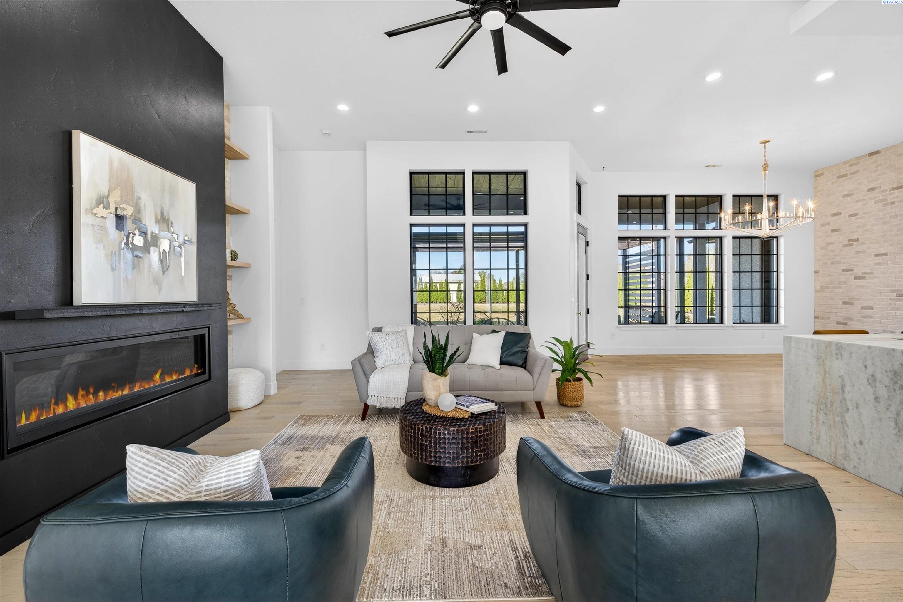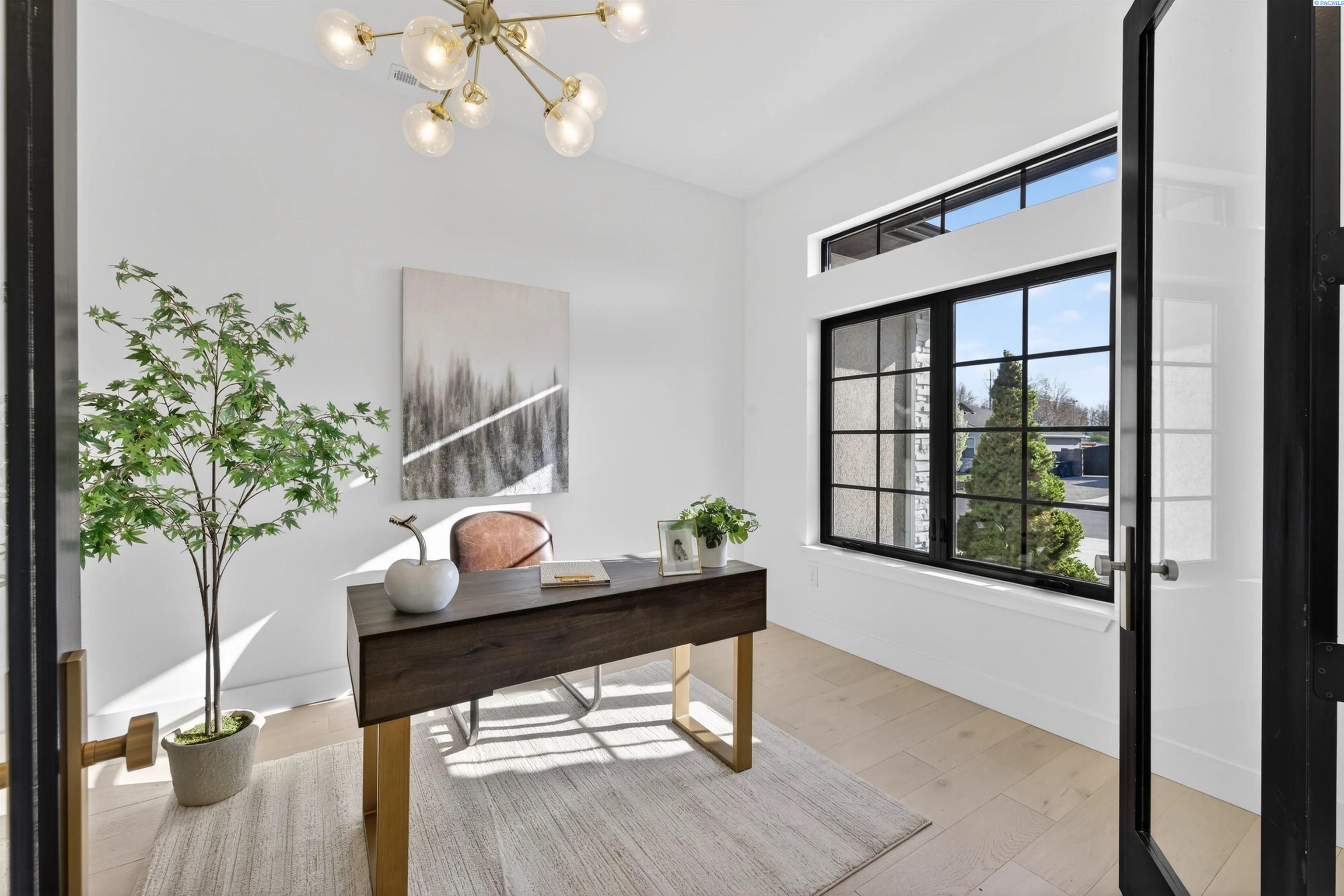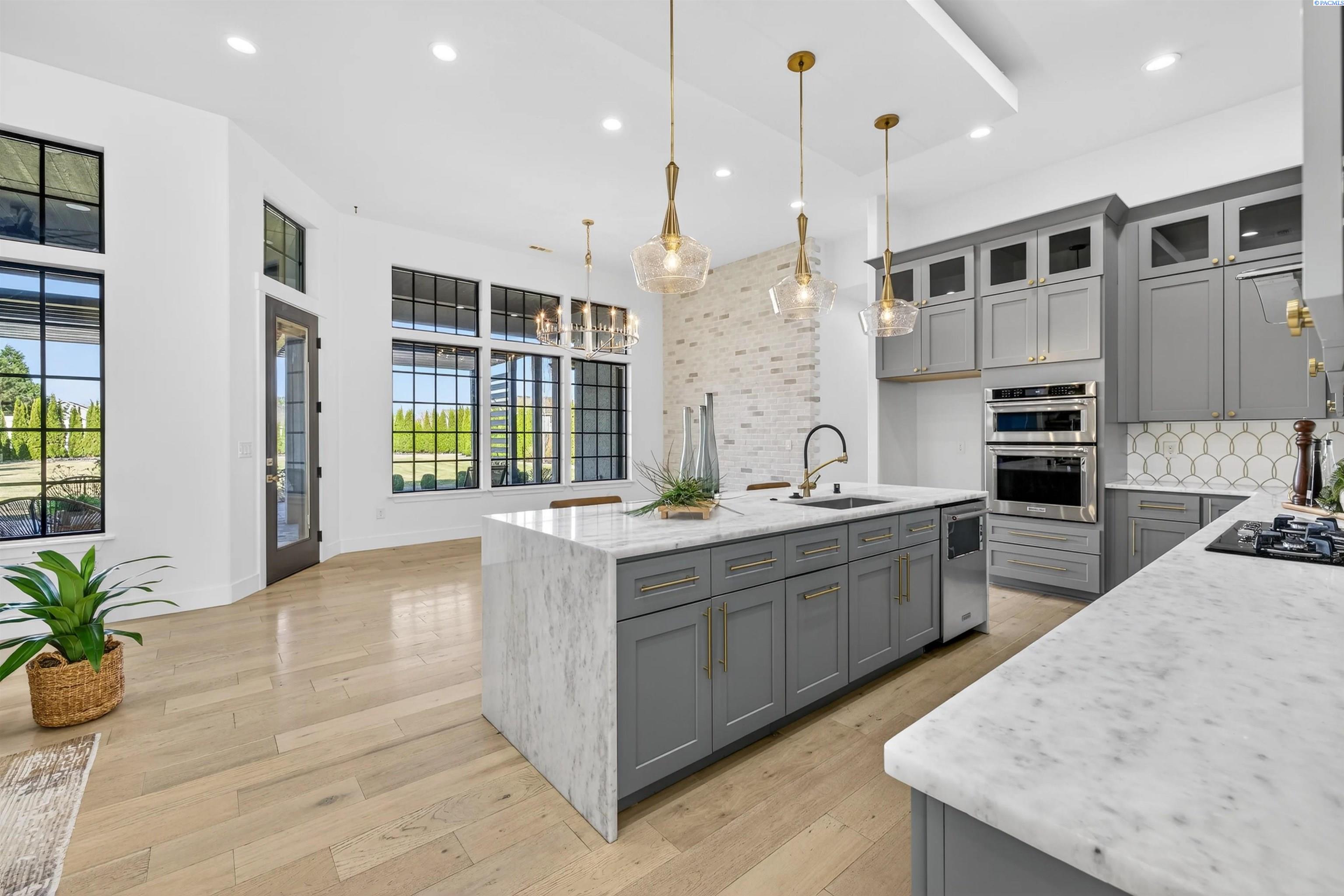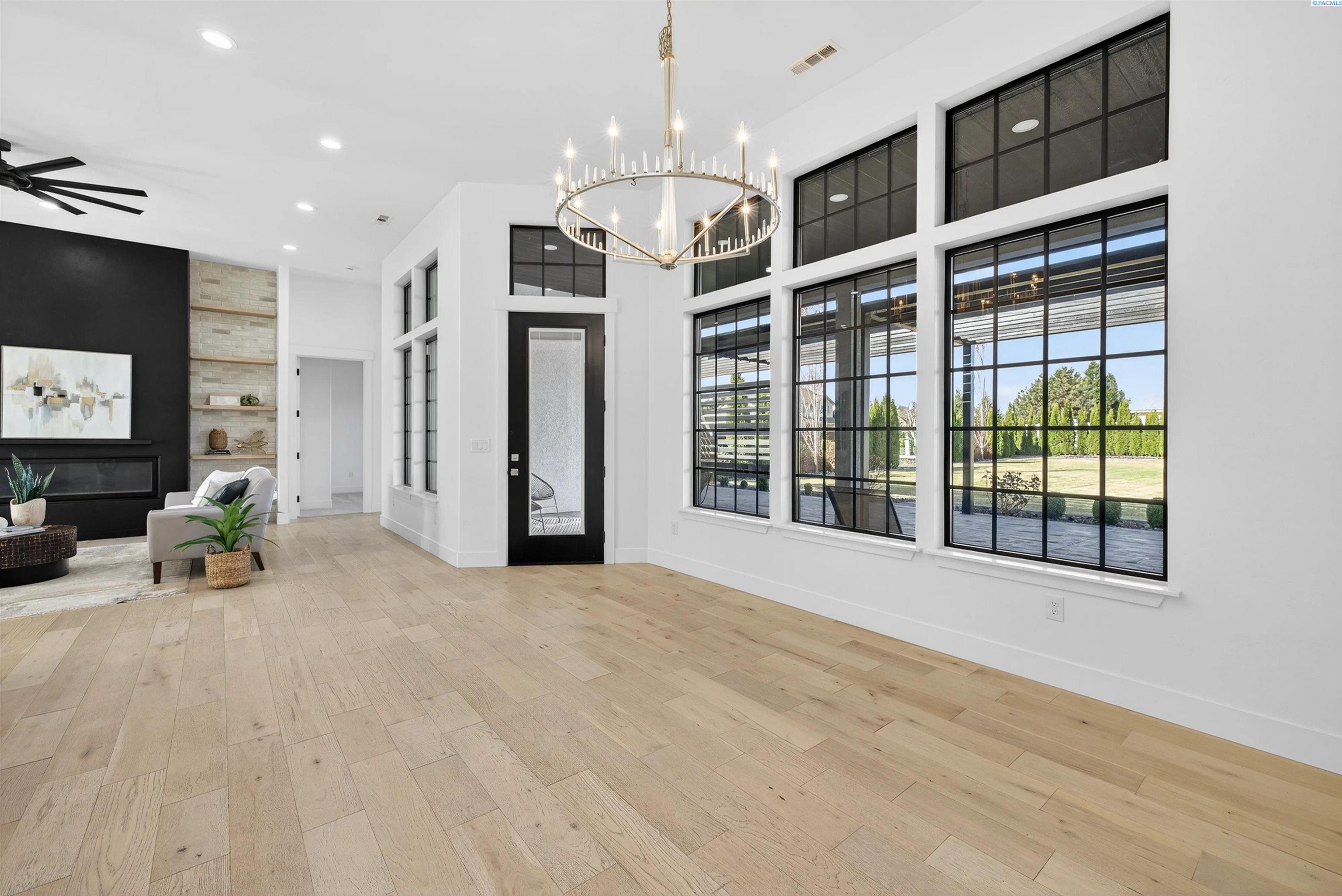 MLS# 291743 Experience a level of craftsmanship and design rarely found in this stunning 2018 custom-built residence, ideally situated on a half-acre a few blocks from the river. Offering 2,818 sq. ft., a 3-car garage, 4 bedrooms, and 3 full bathsâincluding a private junior suite and an expansive primary retreatâthis home also features an office with closet and an additional living space with floor-to-ceiling built-ins, ideal as a library, separate living area, second office, or playroom. From the moment you enter, the scale and detail set the toneâsoaring 12-foot ceilings in the main living areas, 10-foot ceilings throughout, upgraded 8-foot doors, and custom windows flood the home with natural light. The open-concept design seamlessly connects the kitchen, dining, and living spaces, anchored by a stunning marble waterfall island with seating, custom cabinetry, designer hardware, full tile backsplash with wall-mounted faucet over the stove, a large walk-in pantry with built-ins, luxury lighting, and high-end appliances. The living area is both inviting and striking, featuring expansive windows, a custom linear gas fireplace, floor-to-ceiling shelving, and cultured brick accents that extend into the luxurious primary suite. The primary retreat offers a spa-like experience with window seating overlooking the private arborvitae-lined backyard, heated floors, a generous walk-in closet with built-ins, freestanding tub, large tiled shower, and dual sink vanity with marble countertops. Engineered hardwood, custom tile, and designer lighting carry throughout. Additional features include a junior suite with full bath (all bathrooms are beautifully finished with tiled showers and marble countertops), an office w/closet & 8-foot glass French doors, as well as a second living space with full built-ins that can be used as a flex space. Outdoors, enjoy an extended stamped patio, freshly painted pergola, and a large private yard with block fencing and thoughtful landscaping. With extensive upgradesâincluding full-view garage doors and an instant-on tankless water heaterâthis home must be experienced to be fully appreciated. Call for your private showing today!