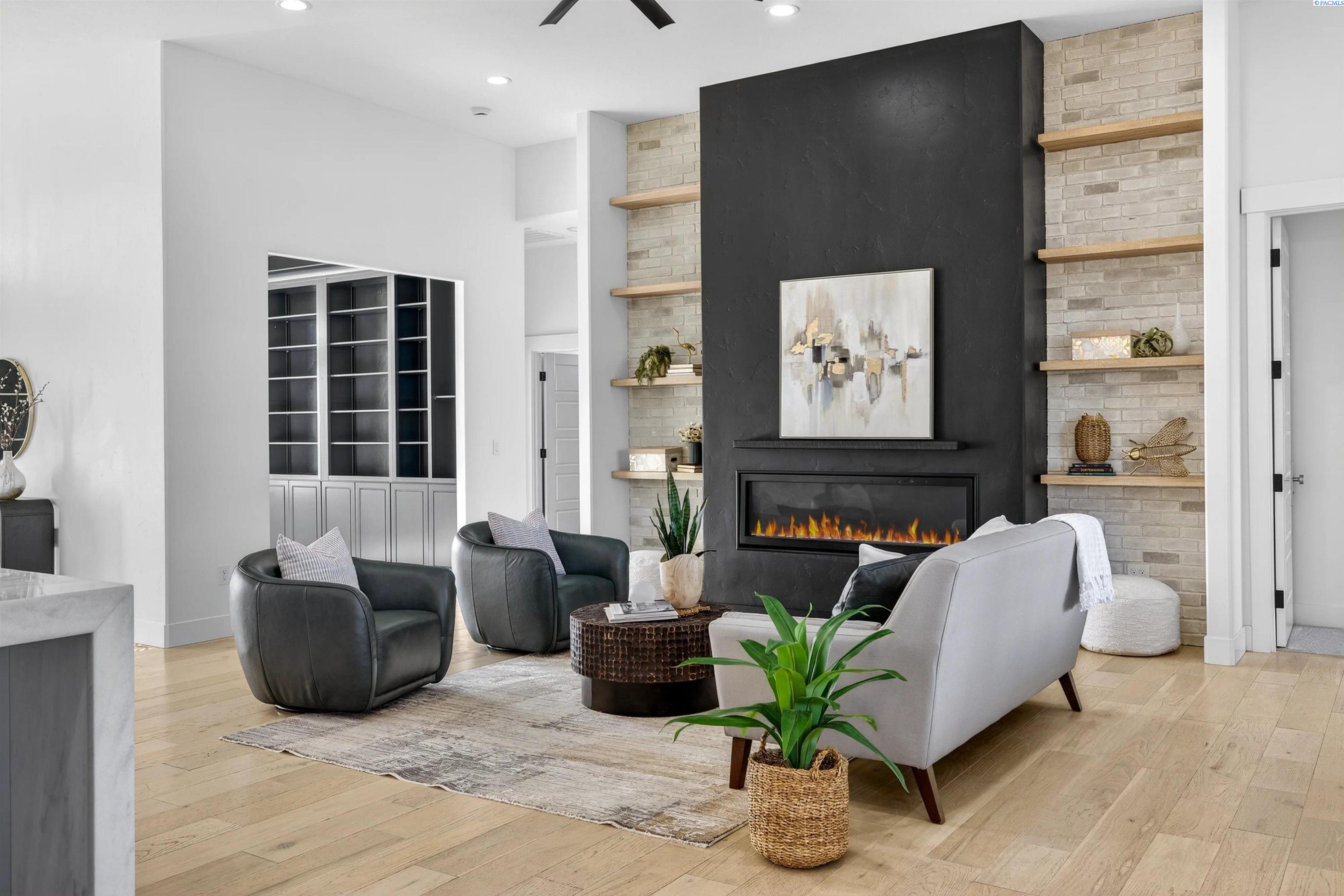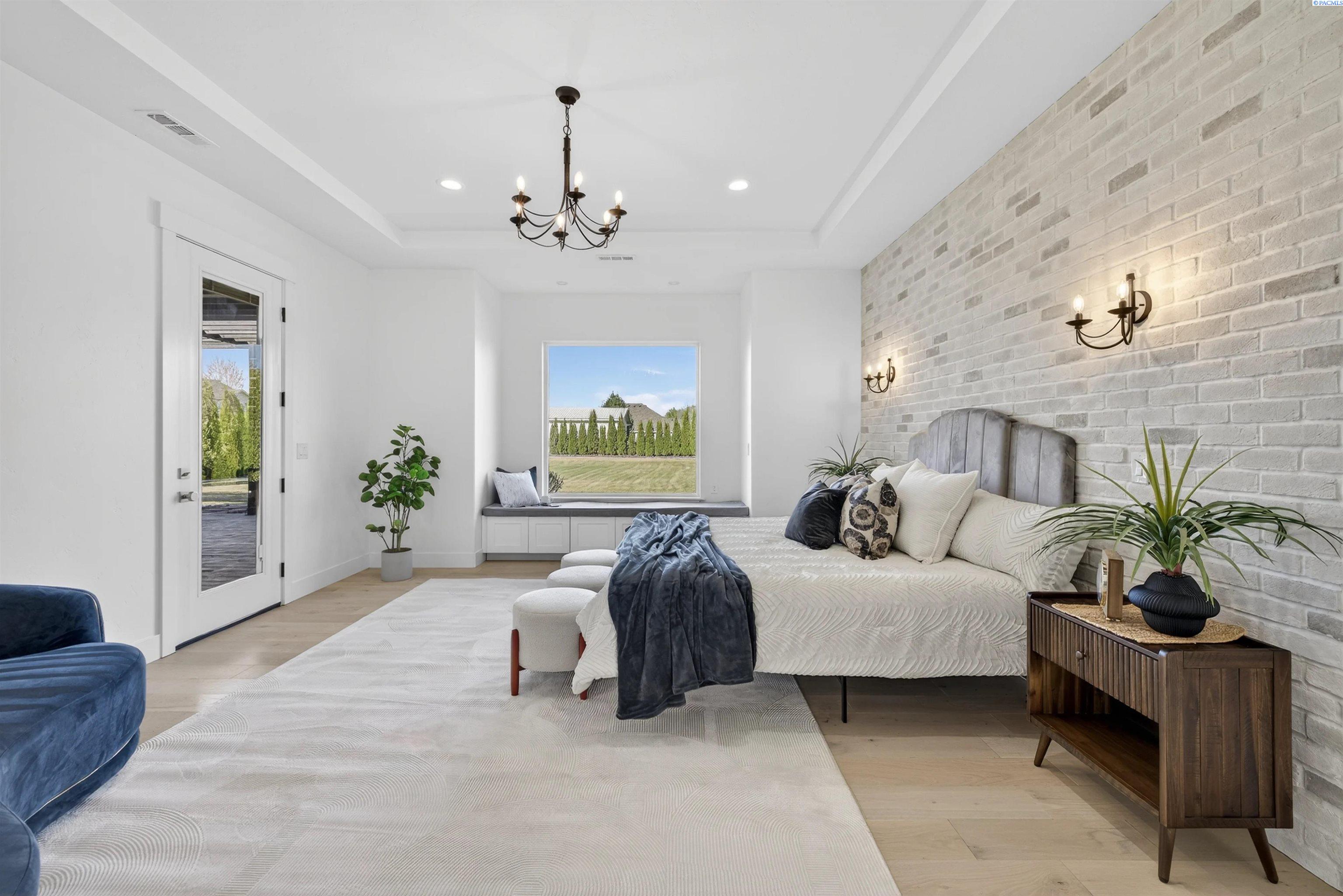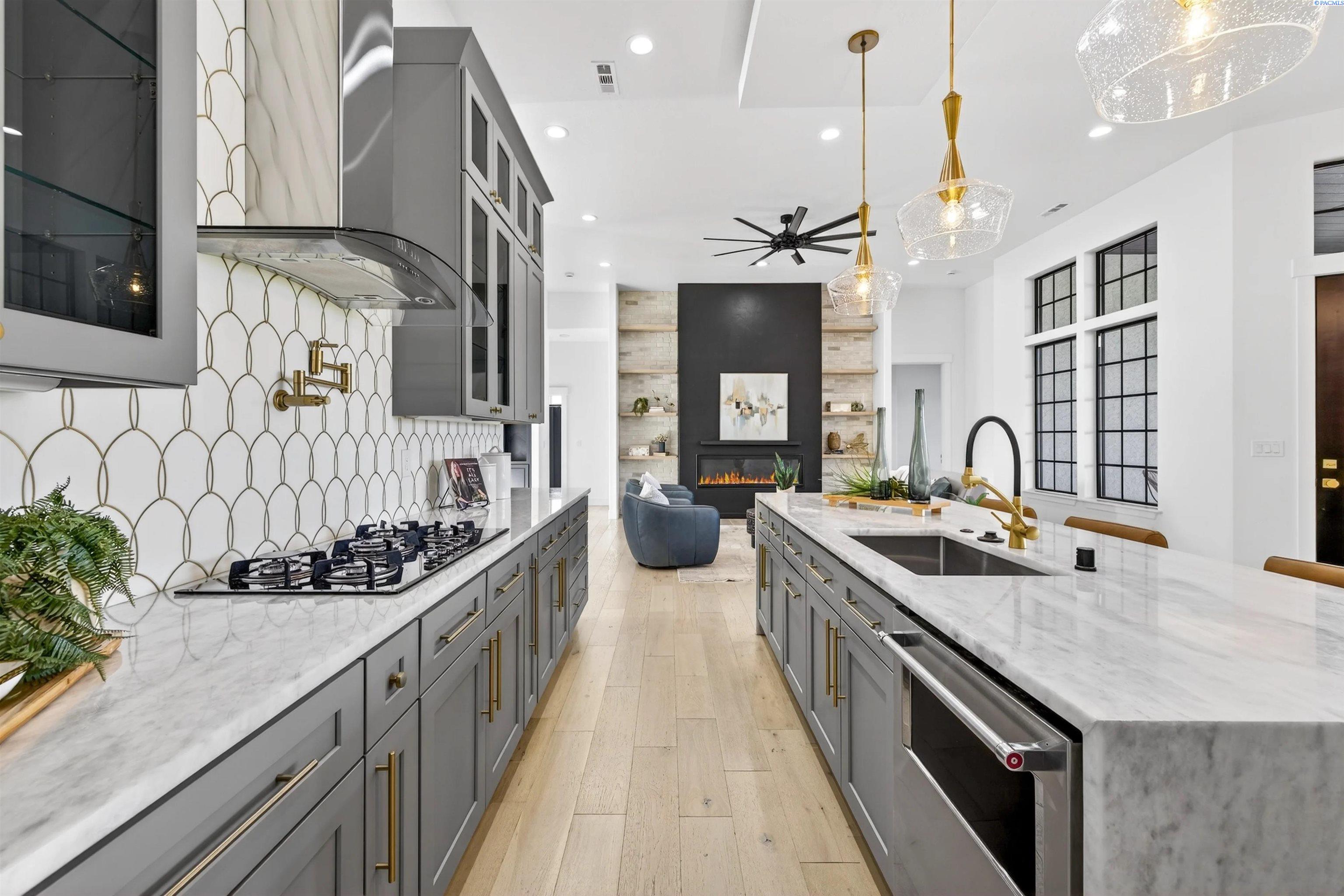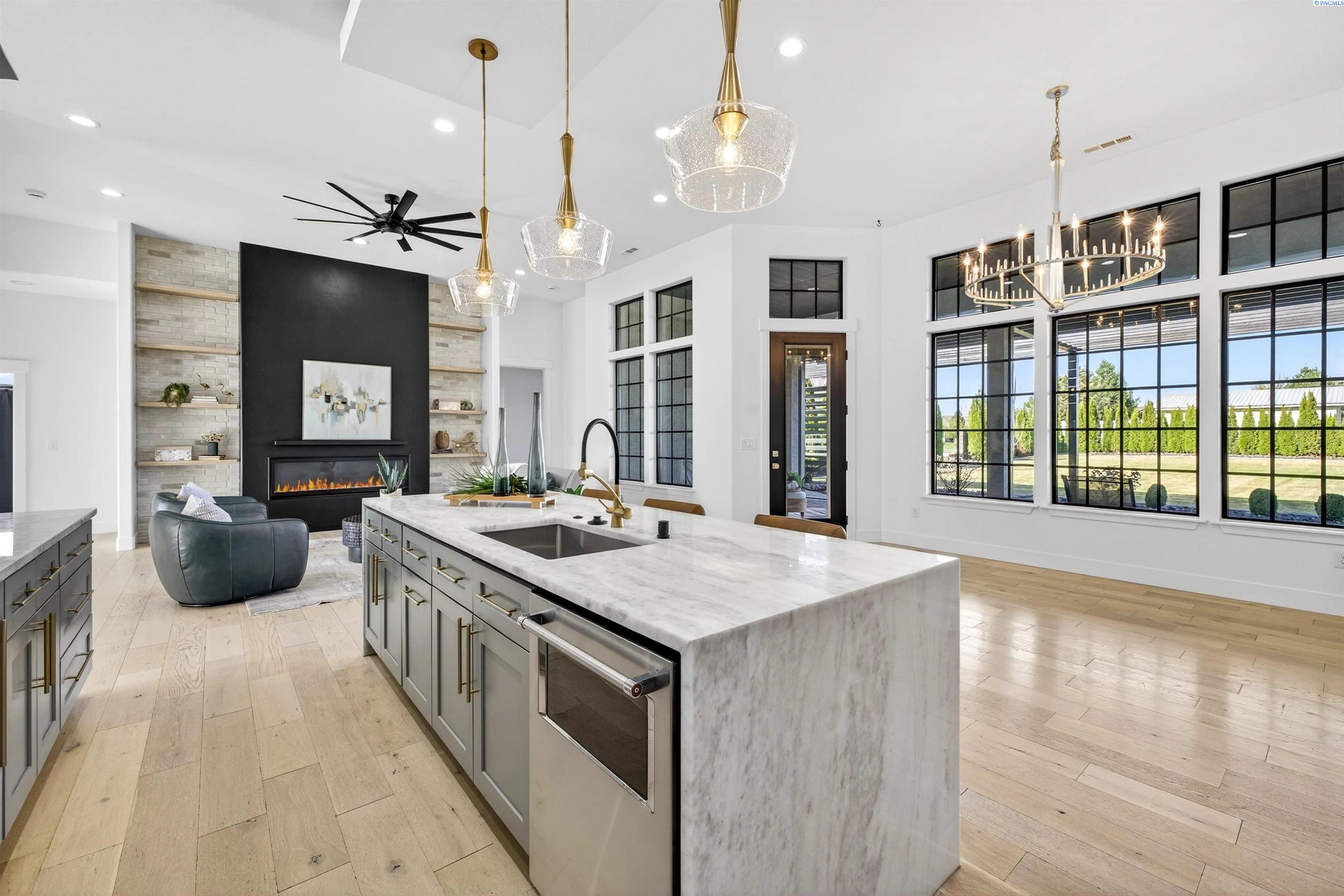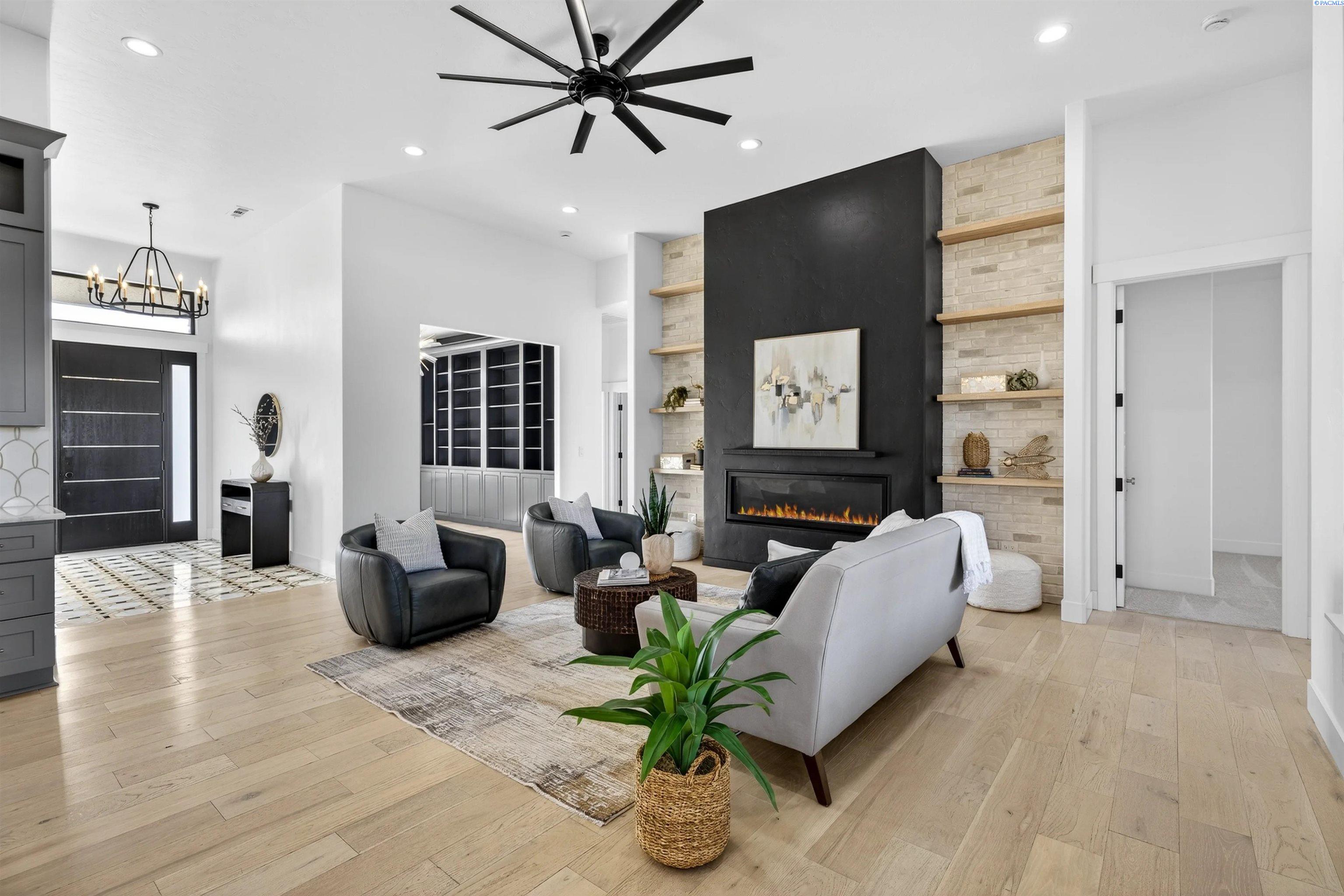 MLS# 291743 Experience a level of craftsmanship and design rarely found in this stunning 2018 custom-built residence, ideally situated on a half-acre a few blocks from the river. Offering 2,818 sq. ft., a 3-car garage, 4 bedrooms, and 3 full bathsâincluding a private junior suite and an expansive primary retreatâthis home also features an office with closet and an additional living space with floor-to-ceiling built-ins, ideal as a library, separate living area, second office, or playroom. From the moment you enter, the scale and detail set the toneâsoaring 12-foot ceilings in the main living areas, 10-foot ceilings throughout, upgraded 8-foot doors, and custom windows flood the home with natural light. The open-concept design seamlessly connects the kitchen, dining, and living spaces, anchored by a stunning marble waterfall island with seating, custom cabinetry, designer hardware, full tile backsplash with wall-mounted faucet over the stove, a large walk-in pantry with built-ins, luxury lighting, and high-end appliances. The living area is both inviting and striking, featuring expansive windows, a custom linear gas fireplace, floor-to-ceiling shelving, and cultured brick accents that extend into the luxurious primary suite. The primary retreat offers a spa-like experience with window seating overlooking the private arborvitae-lined backyard, heated floors, a generous walk-in closet with built-ins, freestanding tub, large tiled shower, and dual sink vanity with marble countertops. Engineered hardwood, custom tile, and designer lighting carry throughout. Additional features include a junior suite with full bath (all bathrooms are beautifully finished with tiled showers and marble countertops), an office w/closet & 8-foot glass French doors, as well as a second living space with full built-ins that can be used as a flex space. Outdoors, enjoy an extended stamped patio, freshly painted pergola, and a large private yard with block fencing and thoughtful landscaping. With extensive upgradesâincluding full-view garage doors and an instant-on tankless water heaterâthis home must be experienced to be fully appreciated. Call for your private showing today!