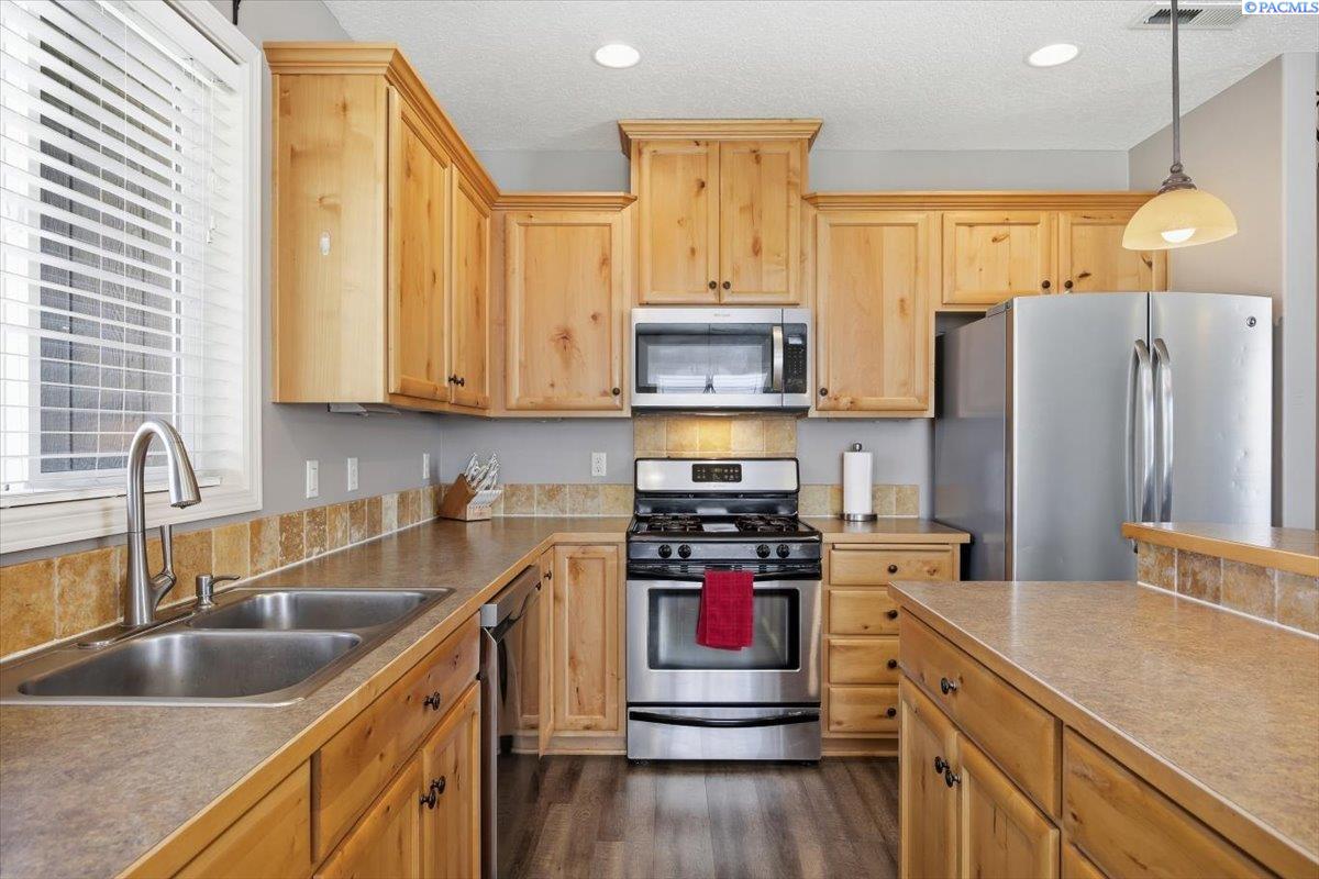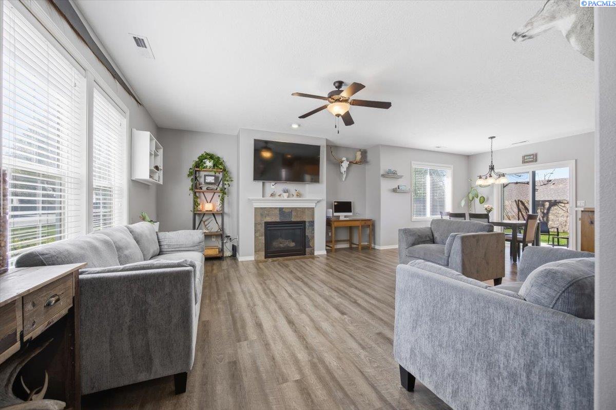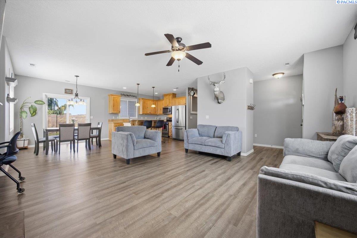 Move-in ready and meticulously maintained, this South Kennewick gem checks all the boxes! Featuring fresh interior paint and an open-concept layout, this 3-bedroom, 2-bath home offers comfortable, modern living with durable LVP flooring throughout the main spaces & newer carpet in the bedrooms for that cozy vibe! The kitchen comes fully equippedâall appliances stay, including the washer and dryerâmaking your move seamless from day one. Step outside to a quiet, private backyard complete with a brand-new cement fence and gate, plus beautifully manicured landscapingâperfect for relaxing or entertaining. The 2-car garage adds convenience and extra storage. Located in the desirable Creekstone community, enjoy paved walking paths throughout, two community parks with basketball courts and playgrounds, and expansive, well-maintained green spaces for recreation. Residents also benefit from private gated parking for boats, trailers, and RVs. Ideally situated near shopping, schools, freeways, and the riverâthis home truly has it all. Bring the moving truck and settle right in!