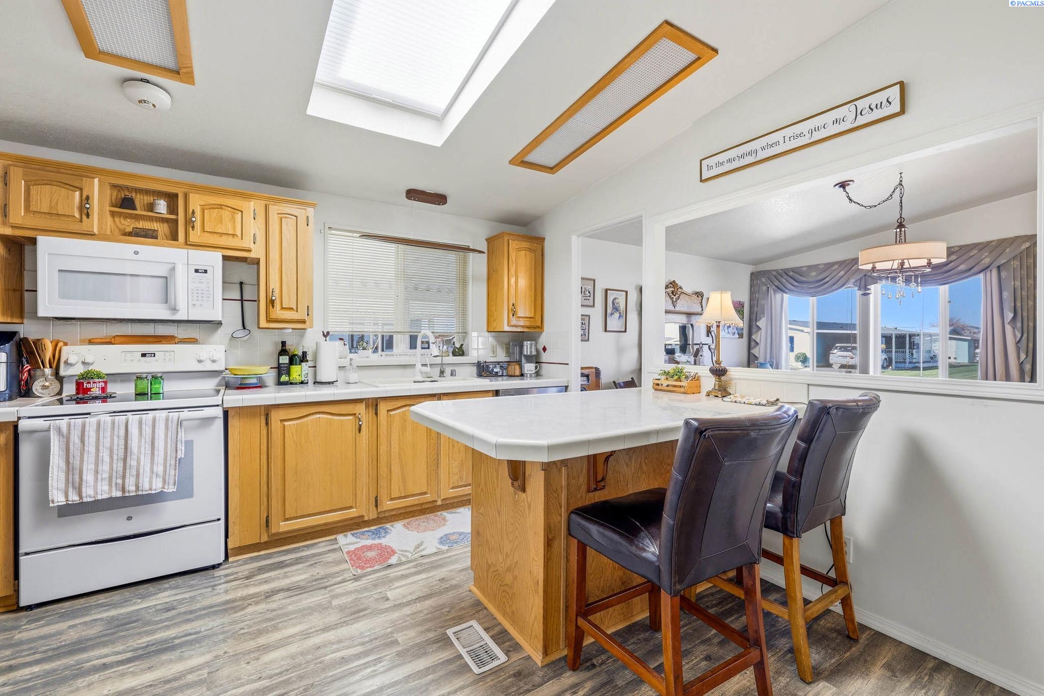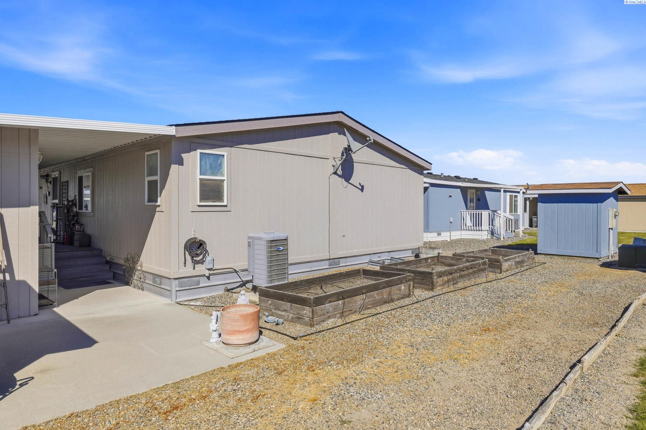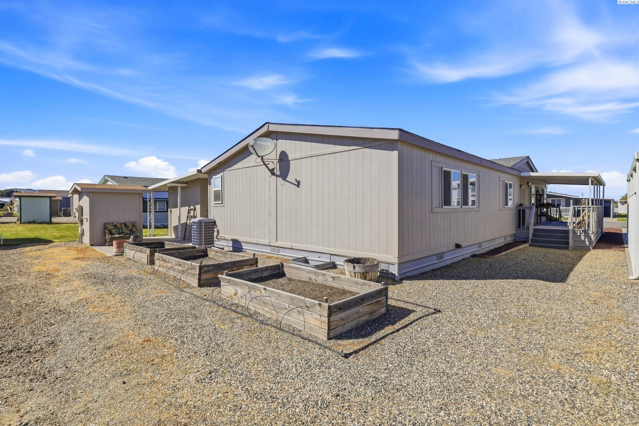 Beautifully maintained 3-bedroom, 2-bathroom home located in a pristine 55+community. This light-filled residence features abundant windows and multiple skylights, creating a bright and inviting atmosphere throughout. The home has been exceptionally well cared for and includes ceiling fans throughout, newer roof and updated skylights. The spacious kitchen and bathrooms showcase stylish tile backsplashes, while all appliances-including washer and dryer-are included for added connivence. The laundry room is equipped with a utility sink. The primary suite offers a relaxing retreat with double sinks and a garden tub in the en-suite bathroom. Outside, enjoy a covered carport with side-by-side parking, two expansive covered wood decks perfect for entertaining or relaxing, raised garden beds, and two storage sheds -one of which is ideal for use as a workshop or hobby space. This move-in-ready home offers comfort, functionality, and outdoor living at its best in a welcoming, well kept community.