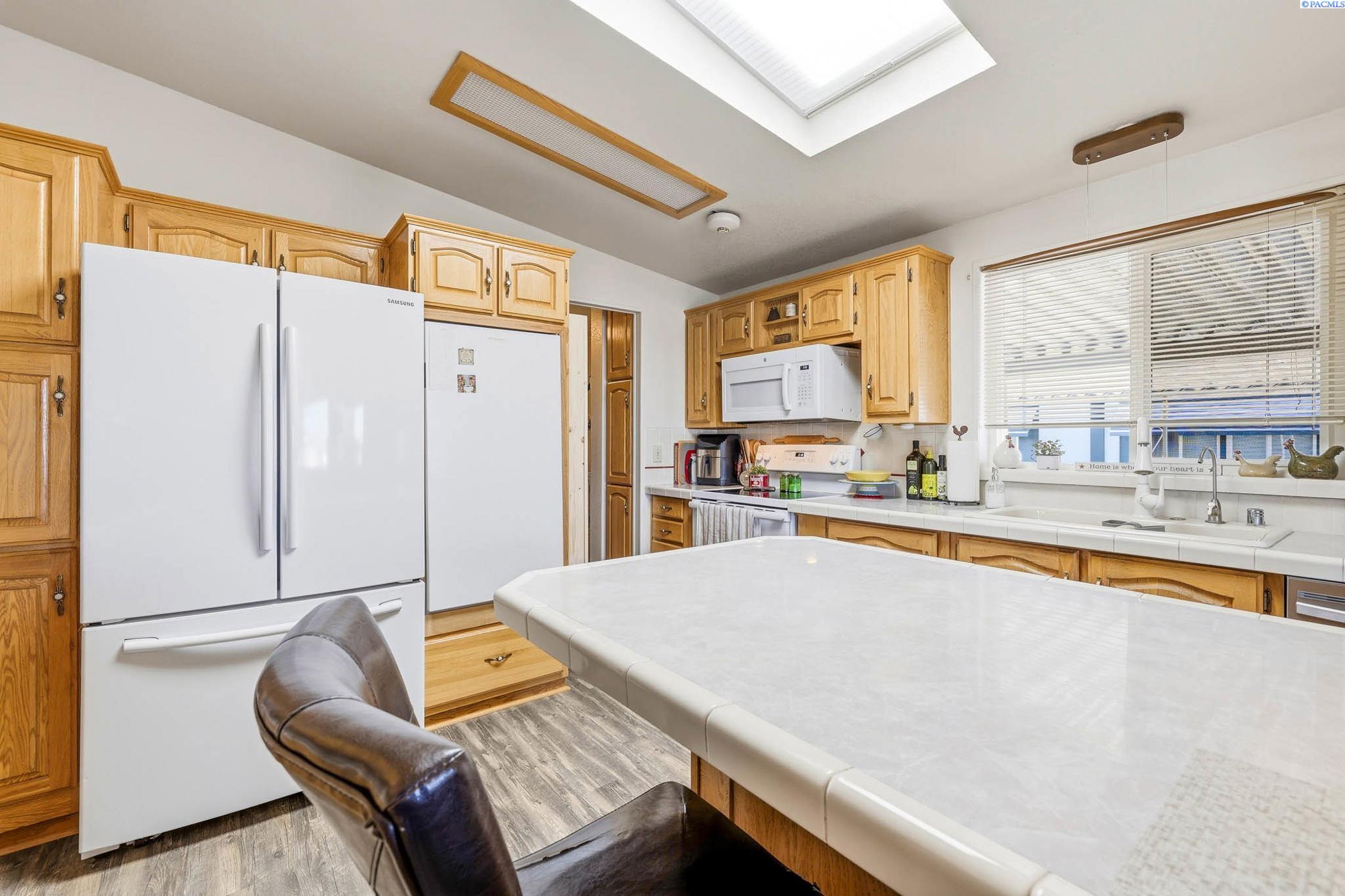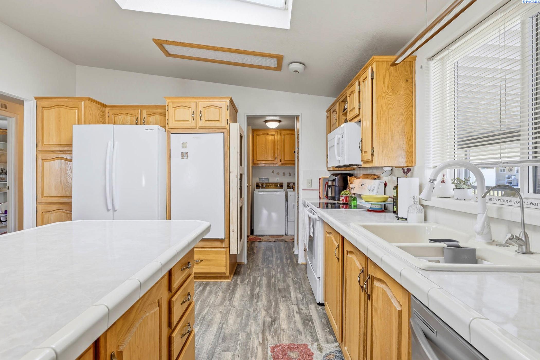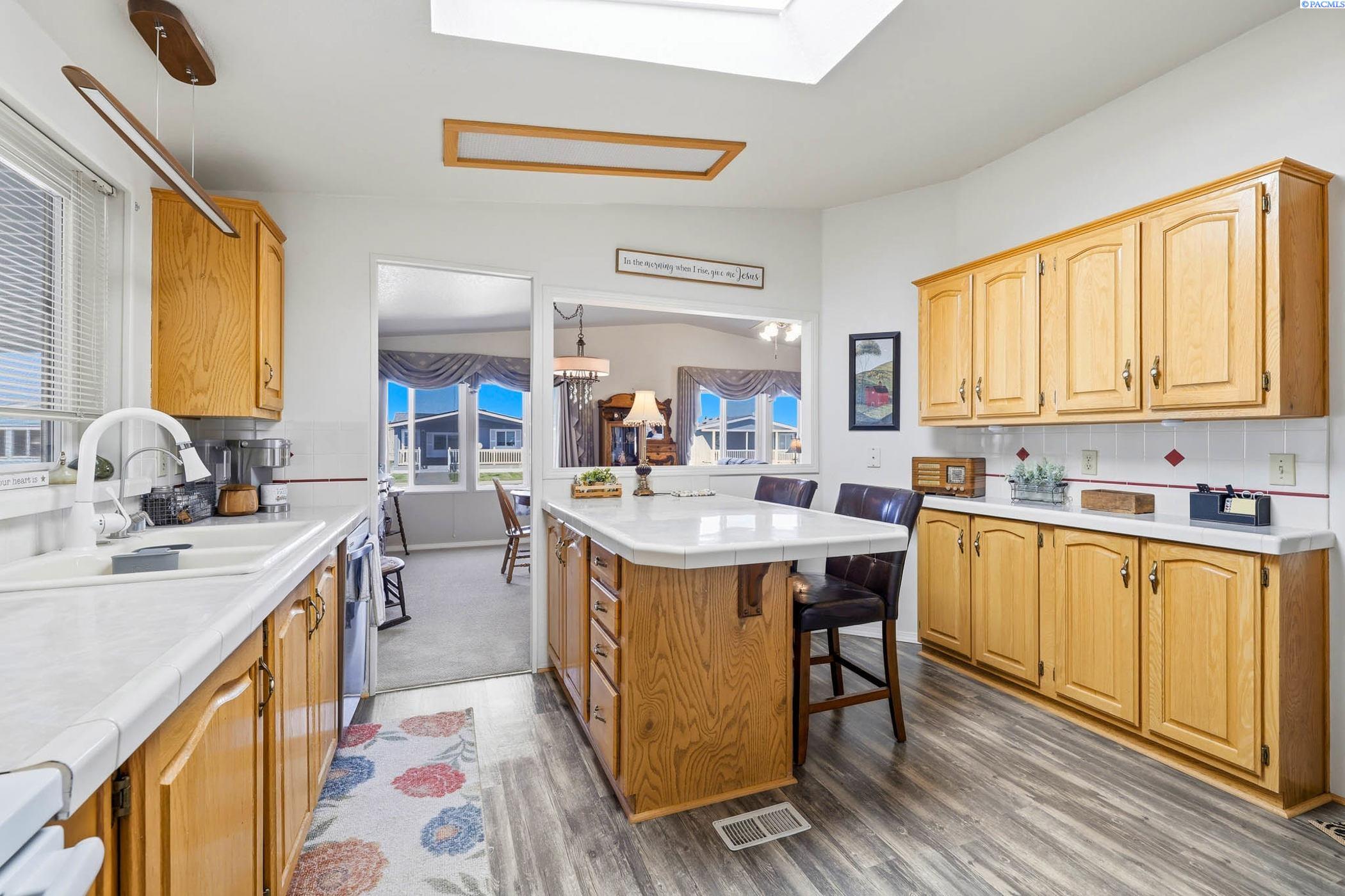 Beautifully maintained 3-bedroom, 2-bathroom home located in a pristine 55+community. This light-filled residence features abundant windows and multiple skylights, creating a bright and inviting atmosphere throughout. The home has been exceptionally well cared for and includes ceiling fans throughout, newer roof and updated skylights. The spacious kitchen and bathrooms showcase stylish tile backsplashes, while all appliances-including washer and dryer-are included for added connivence. The laundry room is equipped with a utility sink. The primary suite offers a relaxing retreat with double sinks and a garden tub in the en-suite bathroom. Outside, enjoy a covered carport with side-by-side parking, two expansive covered wood decks perfect for entertaining or relaxing, raised garden beds, and two storage sheds -one of which is ideal for use as a workshop or hobby space. This move-in-ready home offers comfort, functionality, and outdoor living at its best in a welcoming, well kept community.